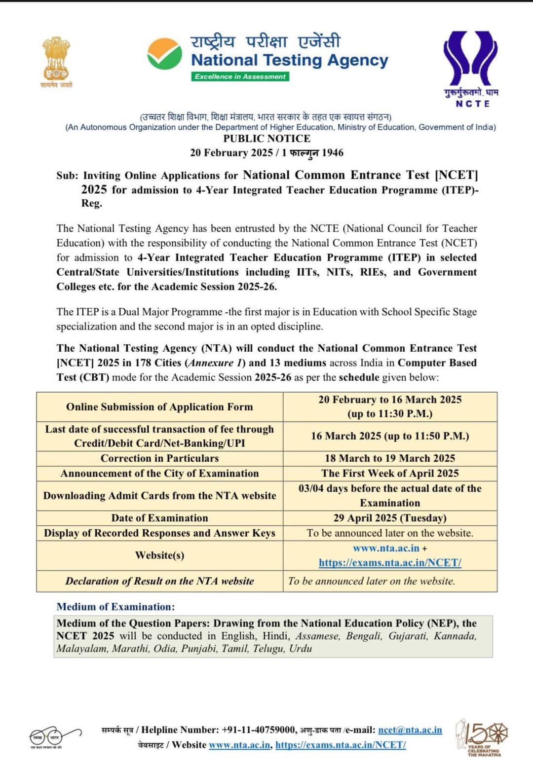 NTA notice regarding National Common Entrance Test (NCET) for admission to Integrated Teacher Education Programme 2025