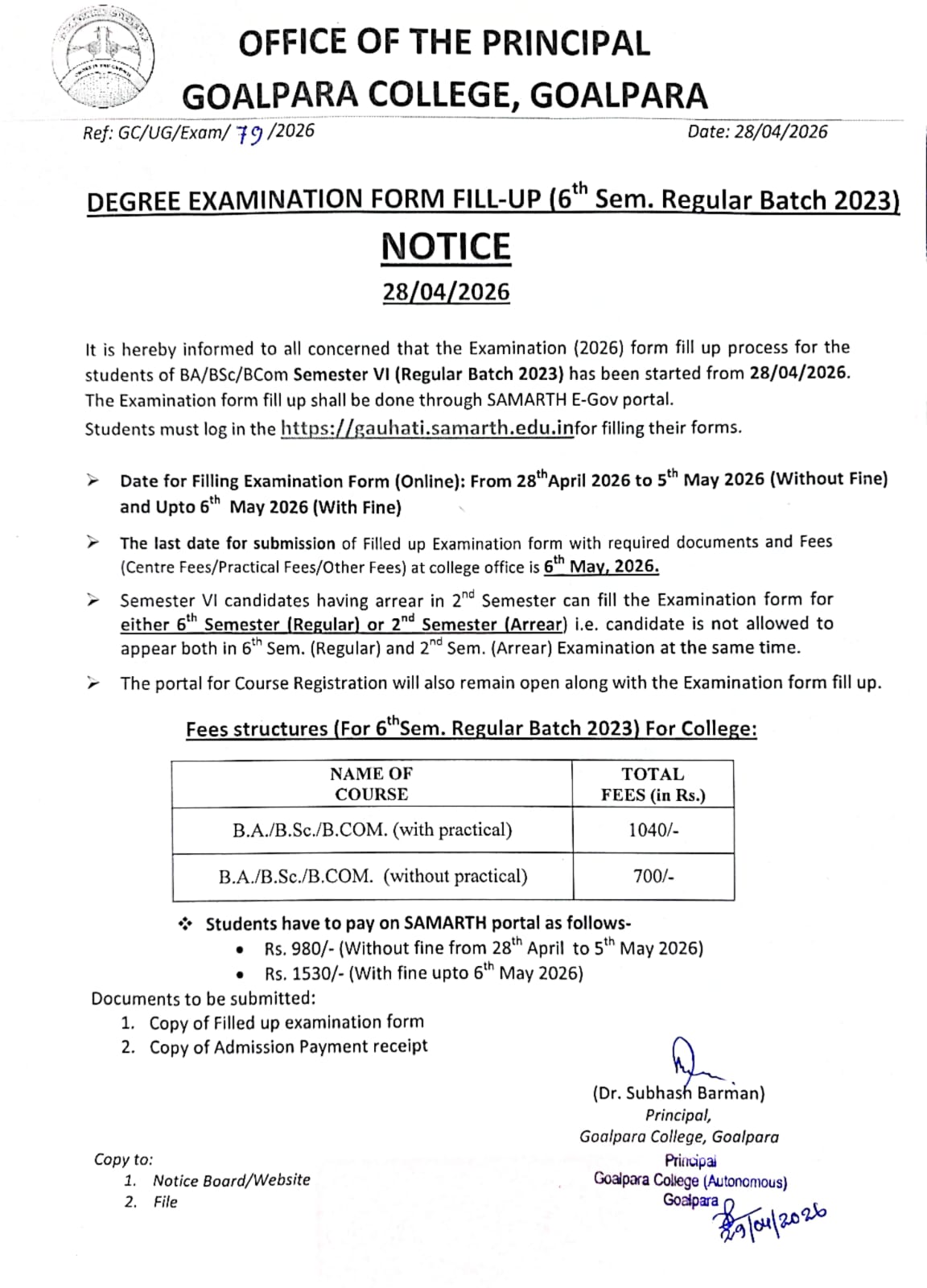 NSS Volunteer of Goalpara College Jahangir Alom Mollah has been awarded the Assam State NSS Award by Department of Sports & Youth Welfare, Govt. of Assam