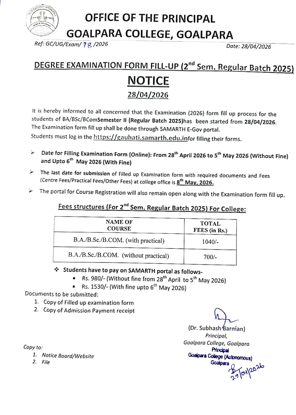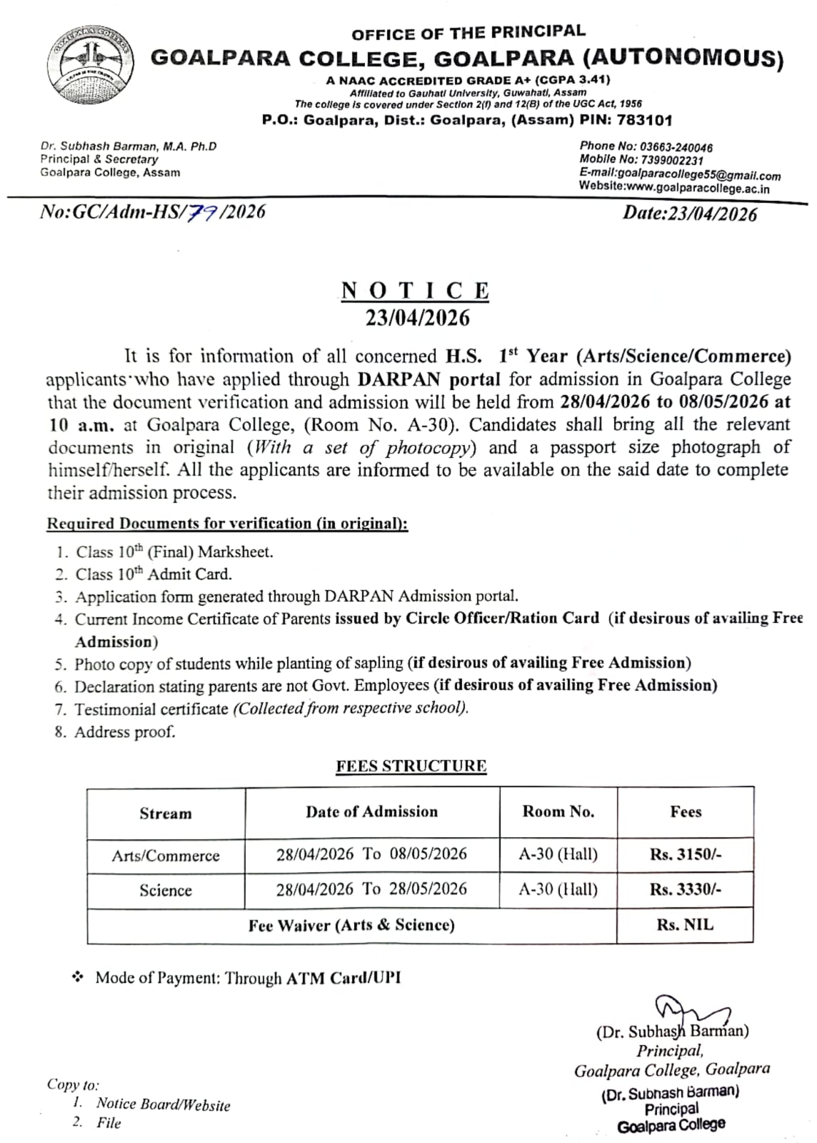 NSS Volunteer of Goalpara College Jahangir Alom Mollah has been awarded the Assam State NSS Award by Department of Sports & Youth Welfare, Govt. of Assam