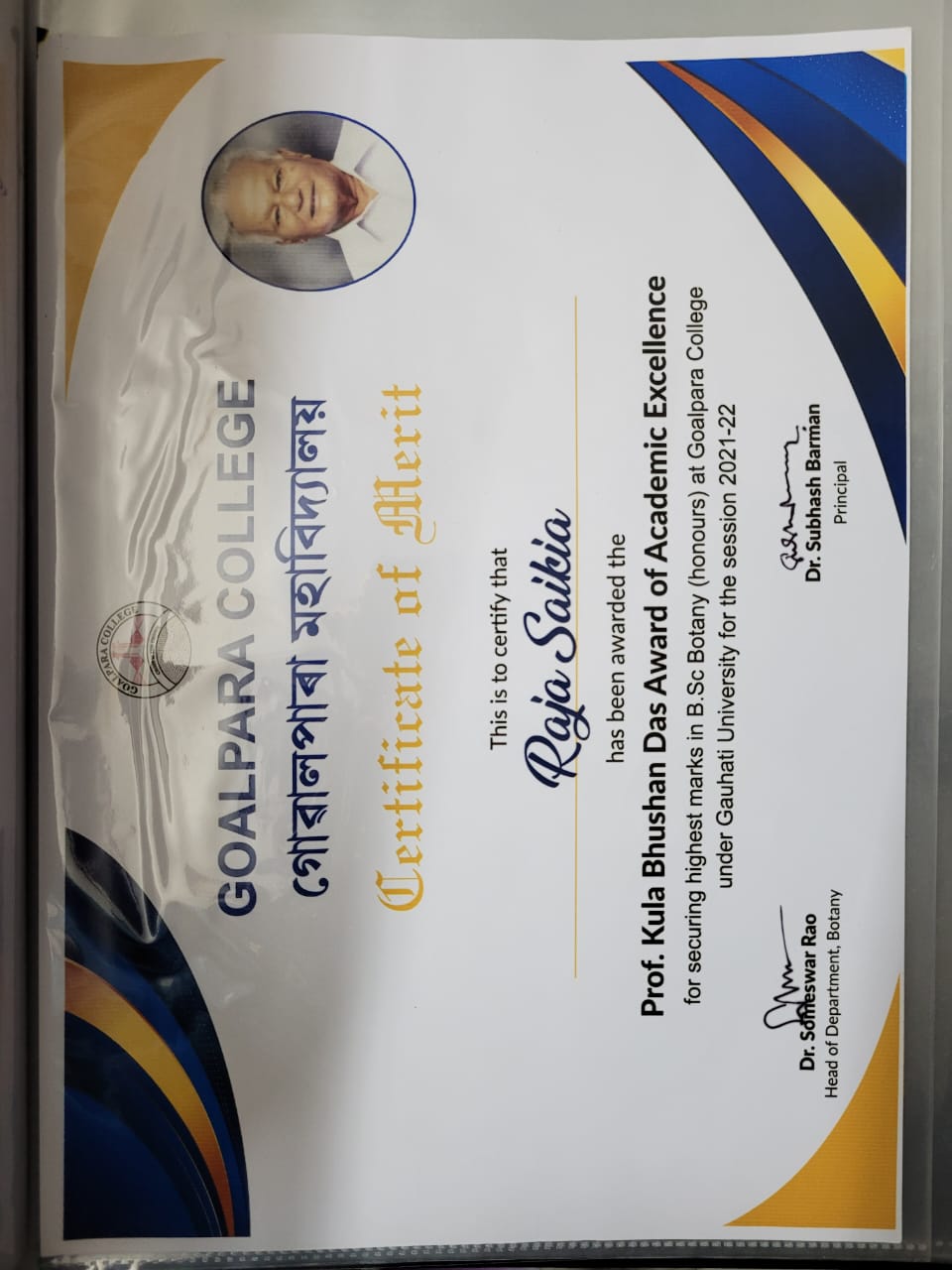 The Botany Department is immensely proud and privileged to announce the institution of an annual award to encourage academic excellence among students, and honour the legacy of its Founder HOD, Professor Kula Bhusan Das. Initiated in 2021, the Award is granted to the Department’s graduating topper, securing the highest grade point in their batch. It’s funded by Professor Das’s daughter, Barnali Das and son, Dr. Diganta Bhusan Das. The award includes Rs. 25,000 as prize money as well as a merit certificate.
