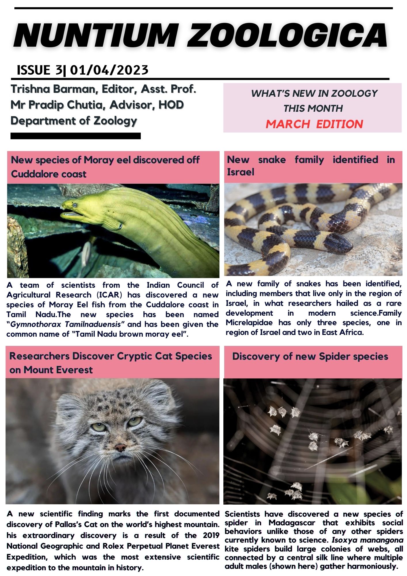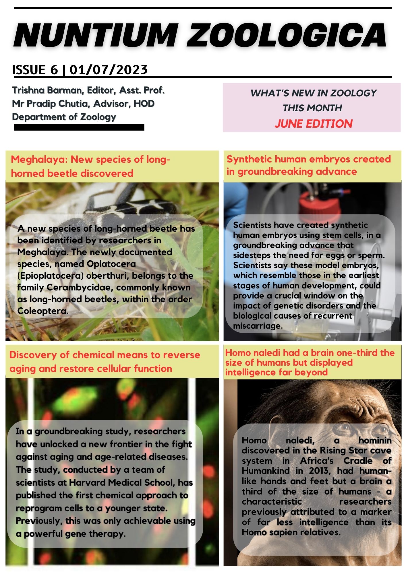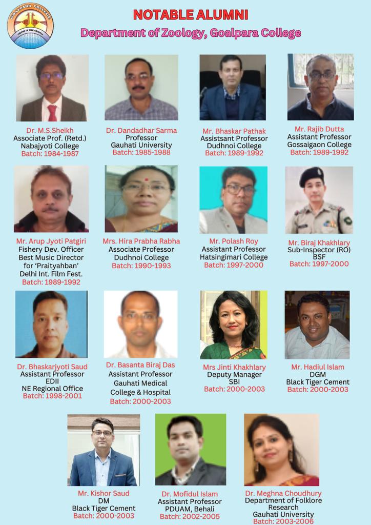 The Department of Zoology was established in the year 1966 with a limited number of faculties and facilities offering PU science course with biology, the College offered Zoology in Degree course in 1972. Mr. Gobinda Kalita was the founder Head of the Department who joined in the college in 1966 and remained in the same post till 30-11-2011.