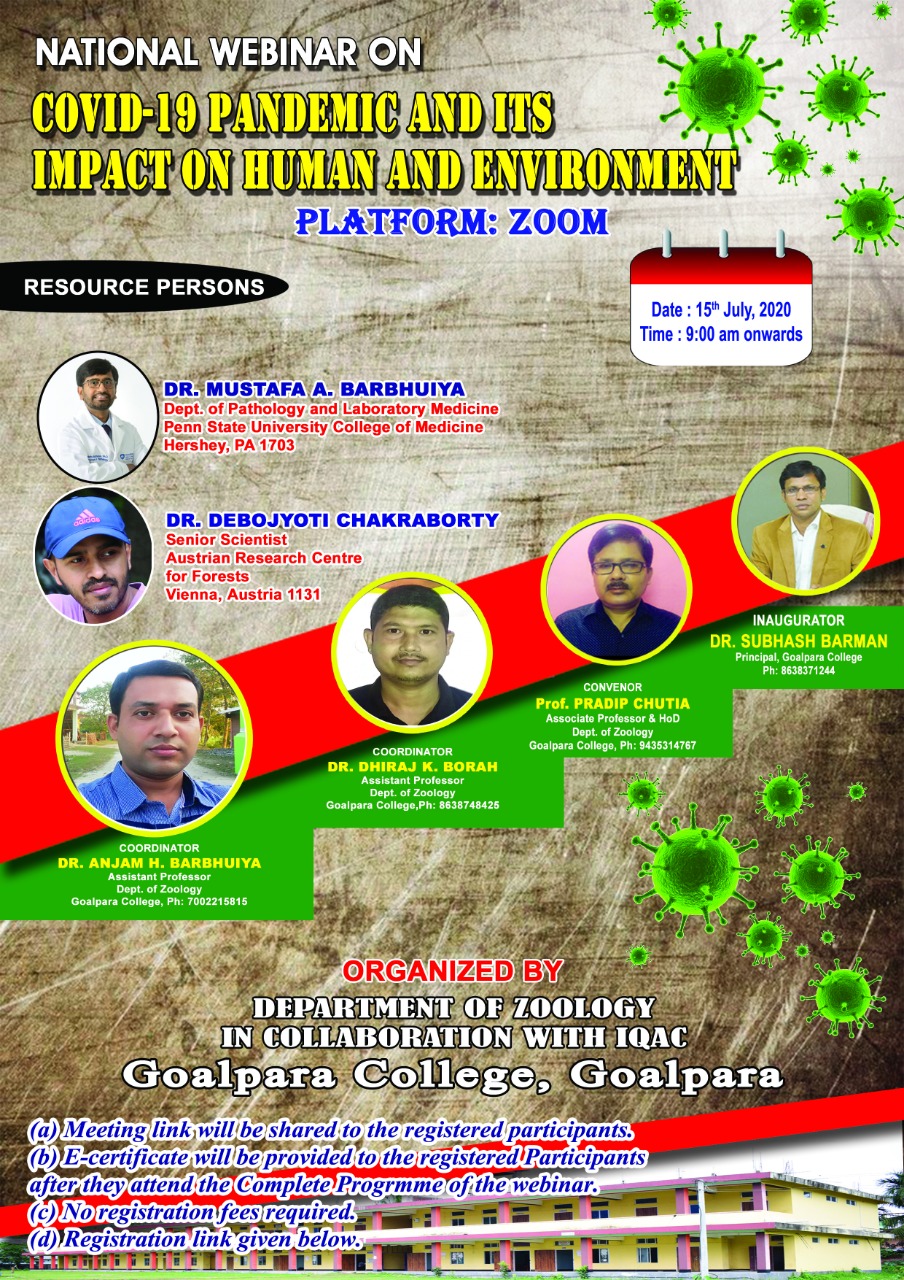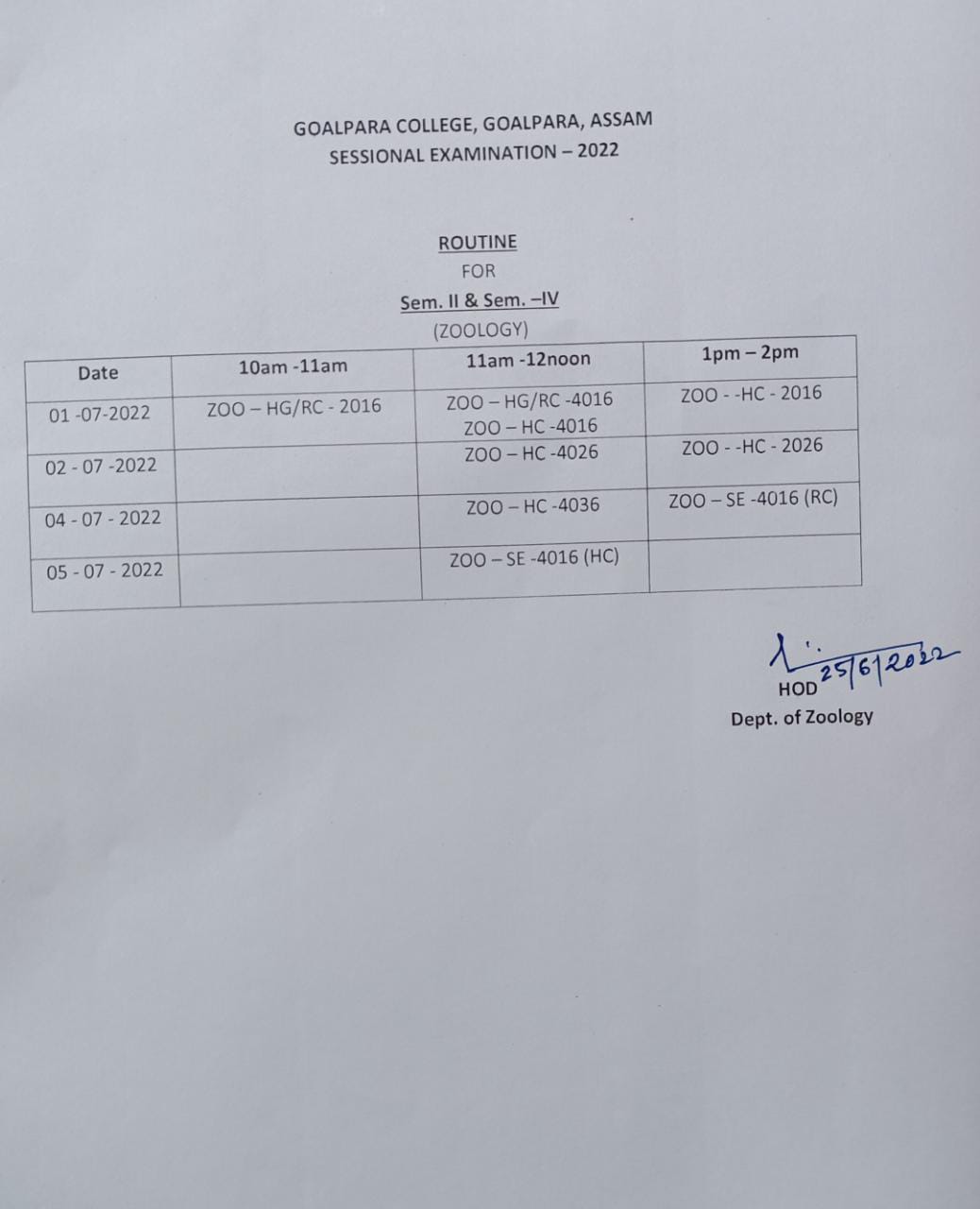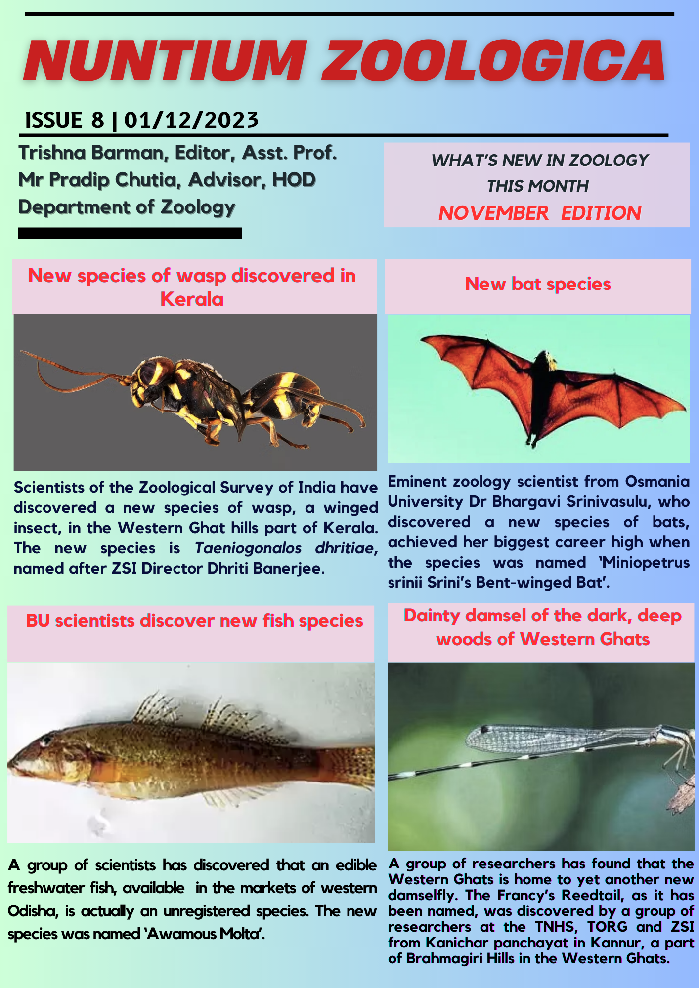 The Department of Zoology was established in the year 1966 with a limited number of faculties and facilities offering PU science course with biology, the College offered Zoology in Degree course in 1972. Mr. Gobinda Kalita was the founder Head of the Department who joined in the college in 1966 and remained in the same post till 30-11-2011.