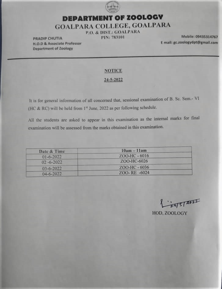 The department is providing quality education in the field of Zoology both in Honours and General course since the last 45 years. The alumni of this department besides holding government jobs in different capacities are also working as faculties in different Colleges, Universities and Research Institutions across the country. The Choice Based Credit System (CBCS) was implemented in the department from the academic session 2019-20. At present, the department is offering B.Sc. Course in Zoology (both Major & General) in Semester system mode for Non-CBCS as well as B.Sc. Course in Zoology (both Honours and Regular) in Semester system mode for CBCS besides, offering the subject in H.S. Science (1st and 2nd Year).
