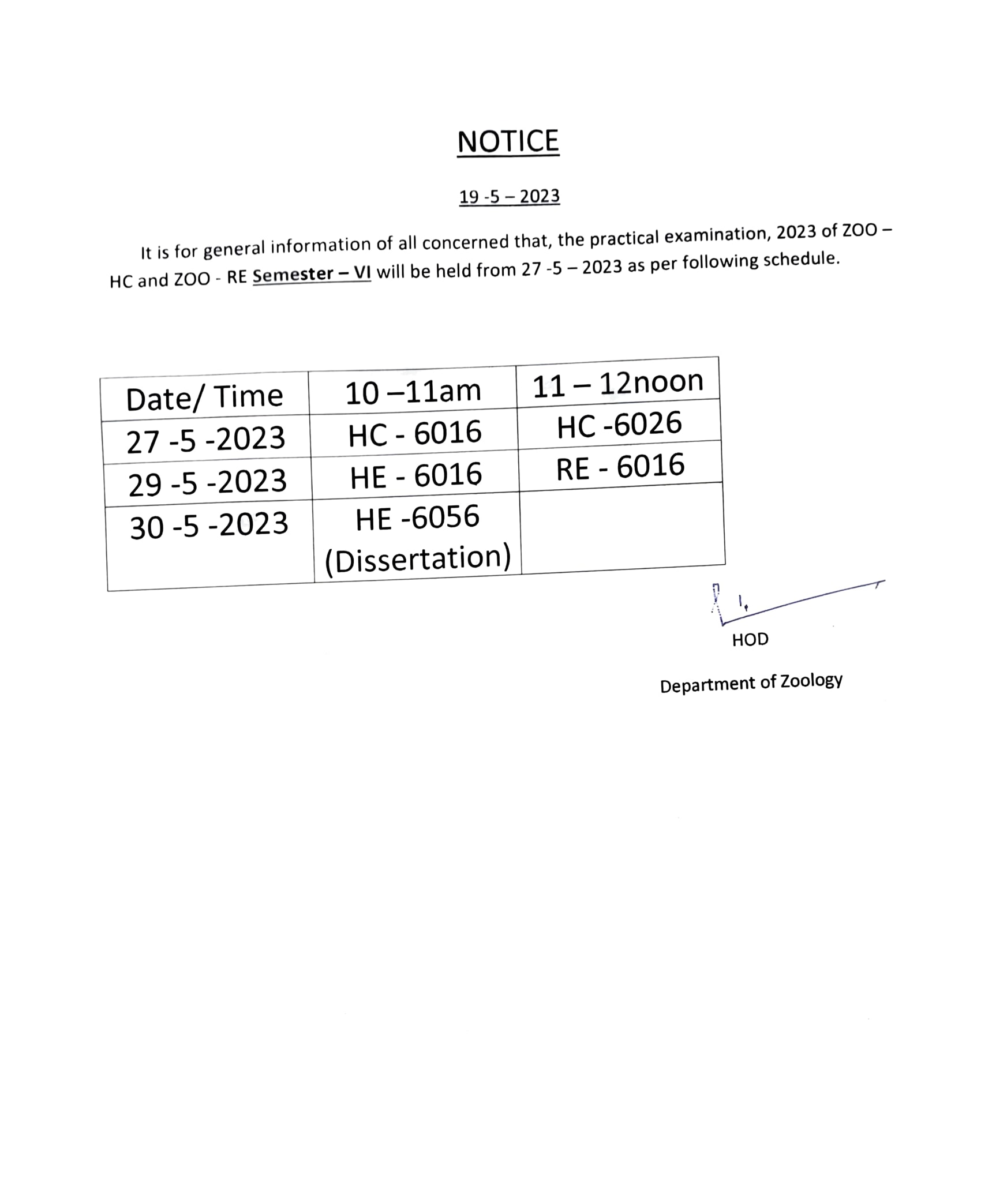 Currently, the students strengths in various standards are: 27 in B.Sc. Semester-I (Honours), 70 in B.Sc. Semester-I (Regular), 24 in B.Sc. Semester-III (Major), 50 in B.Sc. Semester-III (General), 29 in B.Sc. Semester-V (Major), 27 in B.Sc. Semester-V (General), 46 in HS 1st Year and 71in HS 2nd Year. A rich departmental library has been maintained with more than 400 books, which include textbooks and reference books. An issue register is maintained for issuance of books to the teachers and students which is reviewed before the end of each academic session. In addition to the regular classes, seminars are arranged every year among the Zoology Major students.