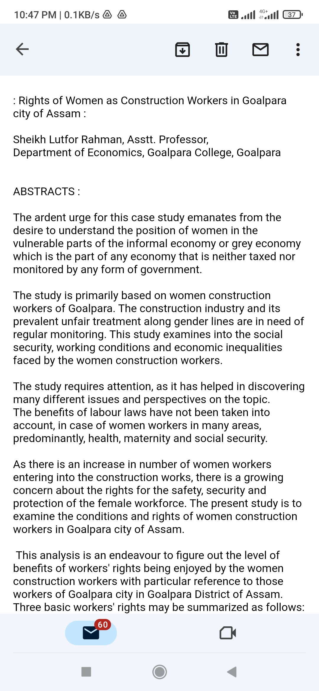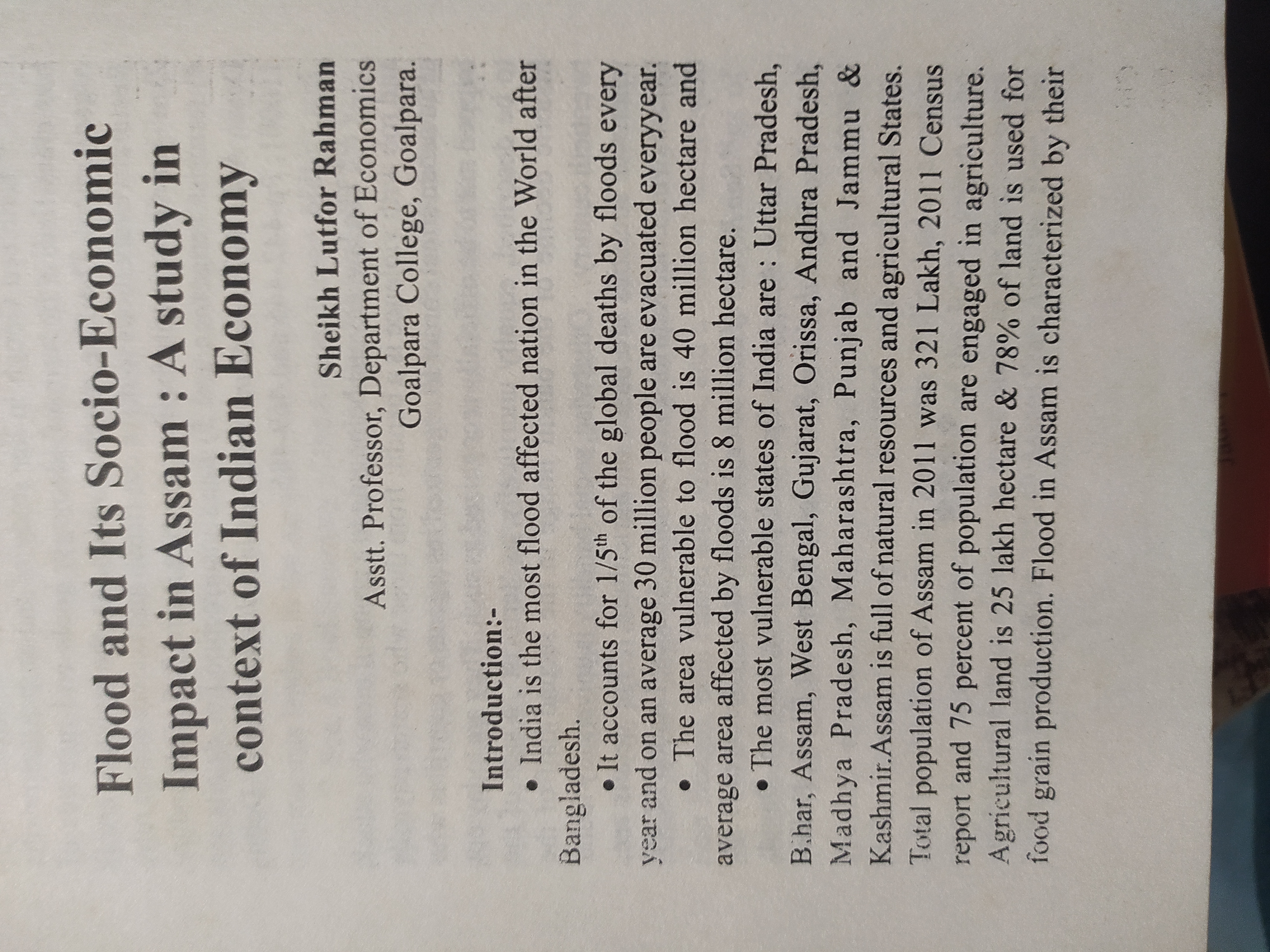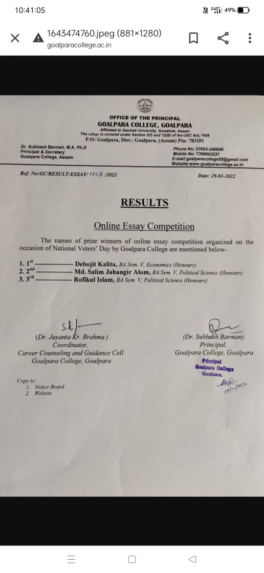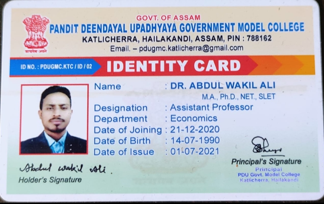 Dept of economics Goalpara College profile 1. The department of economics provides teaching in academic courses of HS and understand graduate level in particular and special classes in post graduate level of IDOL ( an open and distance learning program under Gauhati University). We are providing teaching on under graduate program for both Regular and Honours courses of Arts and science stream. 2. Brief history of the department-- The department was started from the date of the establishment of the college on the 8th August/1955 as an affiliated institution of higher education under Gauhati University. The founder faculty members of the department are Prof Jyotis Das, Prof Troilokya Baruah and Prof. Bishnu Prasad khaund. At the starting the department was only for Arts but with the starting of science stream in the college in the year 1966, the department joints the science stream with introduction of econometrics as one of the optional paper in hons/major course. 3. In 1993 the GU permitted MA course in the department, but with the starting of IDOL the GU stopped permission of admission in MA in Economics in the Goalpara College. 4. Present faculty members who are working in the department-- 1. Abdul Hussain,. M.Sc., Associate professor & HOD. 2. Dr. Manisha Bhattacharyya, Associate Professor, { left the department in August, 2022 for being selected as Principal, West Goalpara College} 3. Lutfor Rahman, M.A., M.Phil, Asstt Prof. ( Senior scale) 4. Rituparna Kalita, M.A., M.Phil, PhD (ongoing) Assistant professor